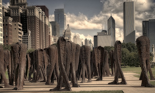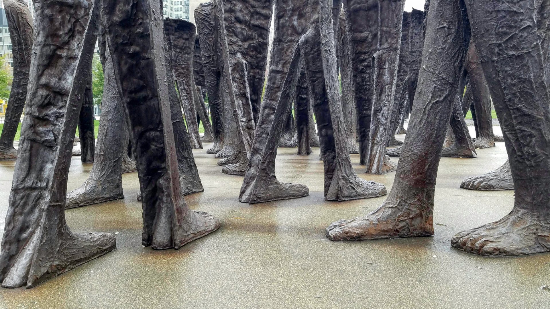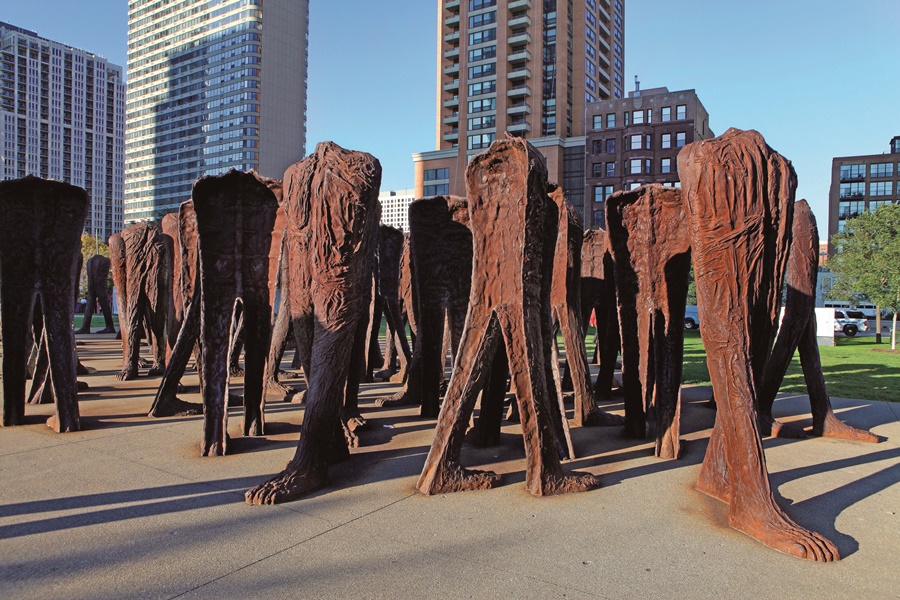 Agora is one of Chicago’s most recent and important sculptural installations. Comprised of 106 nine-foot tall headless torsos made of cast iron, the artwork derives it name from the Greek word for meeting place. The figures are posed walking in groups in various directions or standing still. Agora is her largest permanent installation.
